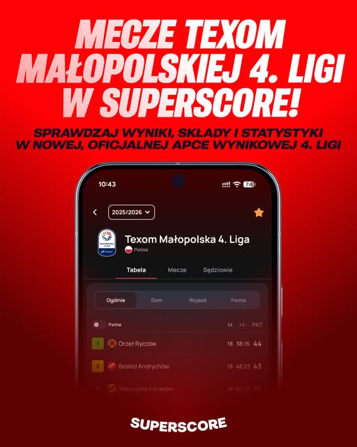 Mecze Texom Małopolskiej 4. Ligi w aplikacji Superscore! Pobierz i nie przegap żadnej bramki